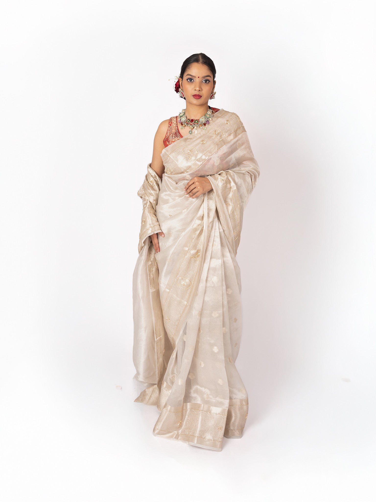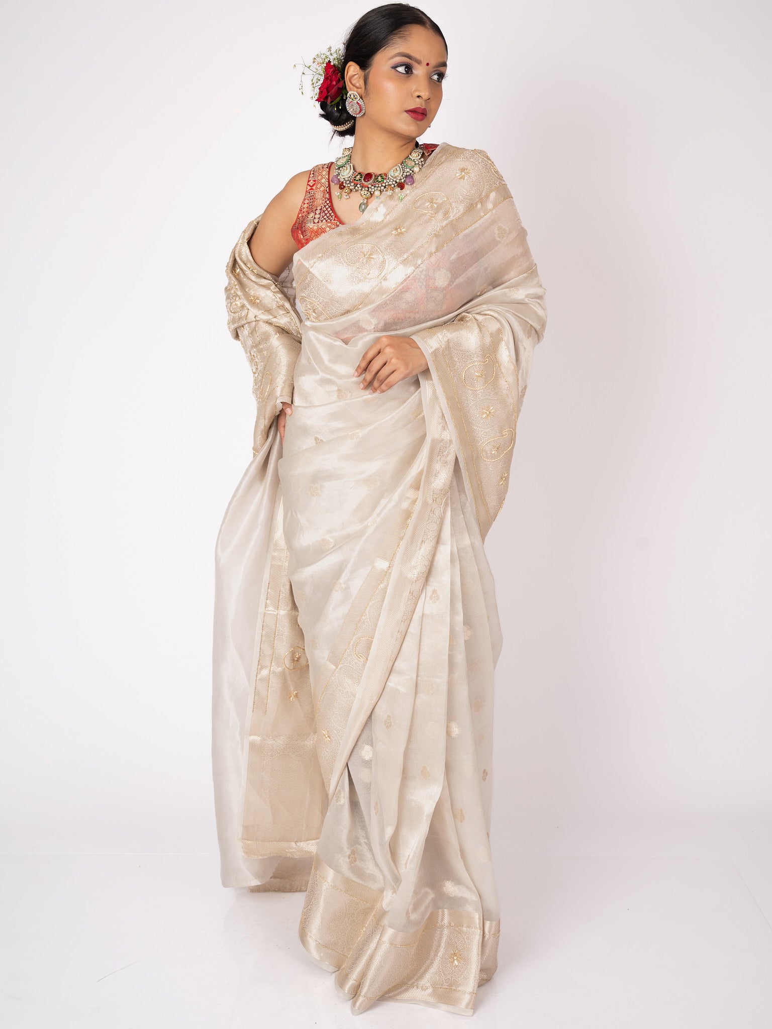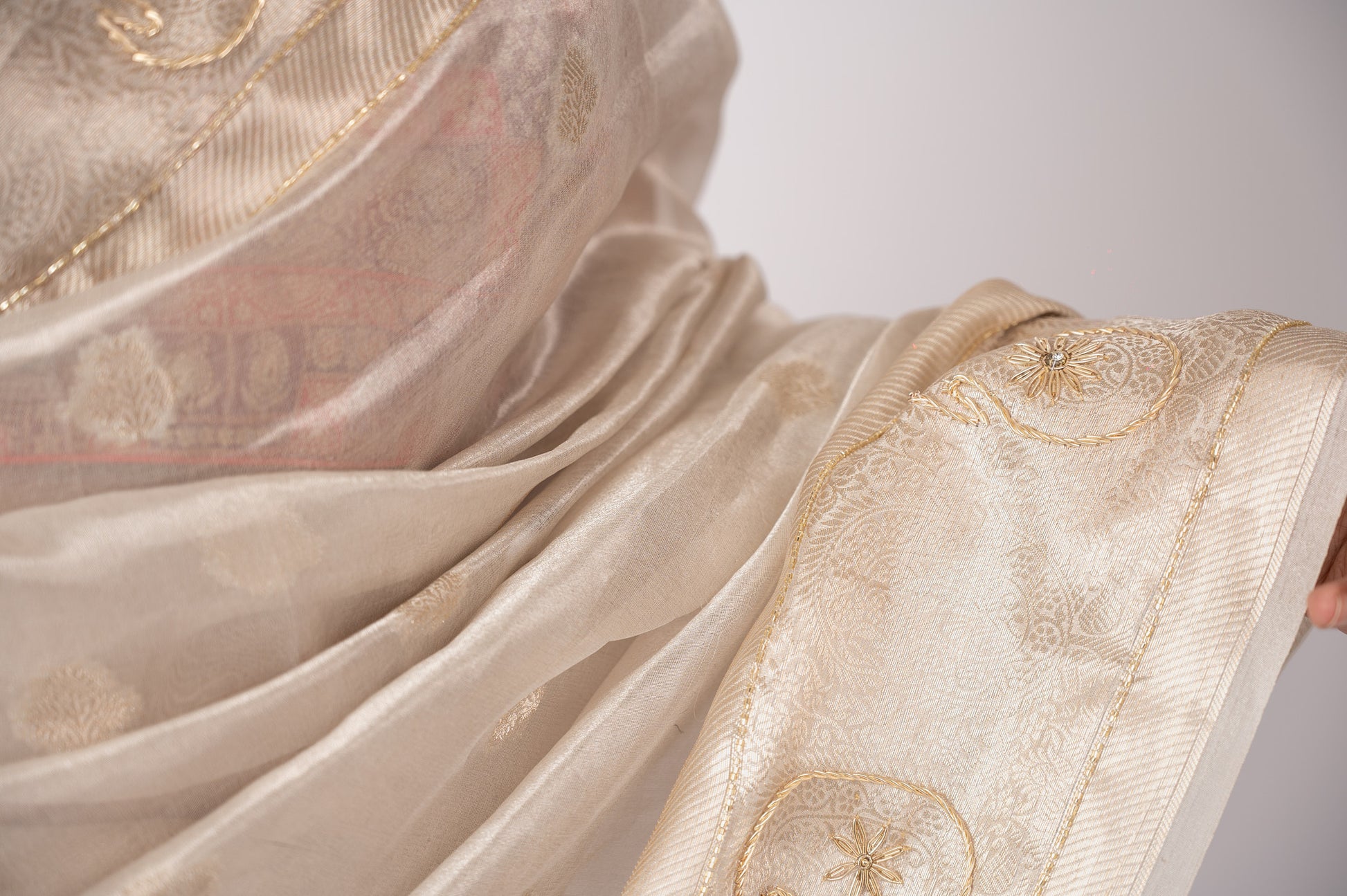 This luxurious tissue saree shimmers with silk and zari, elevated by intricate handwork. Elegant and timeless, it embodies artisanal craftsmanship with a touch of opulence.