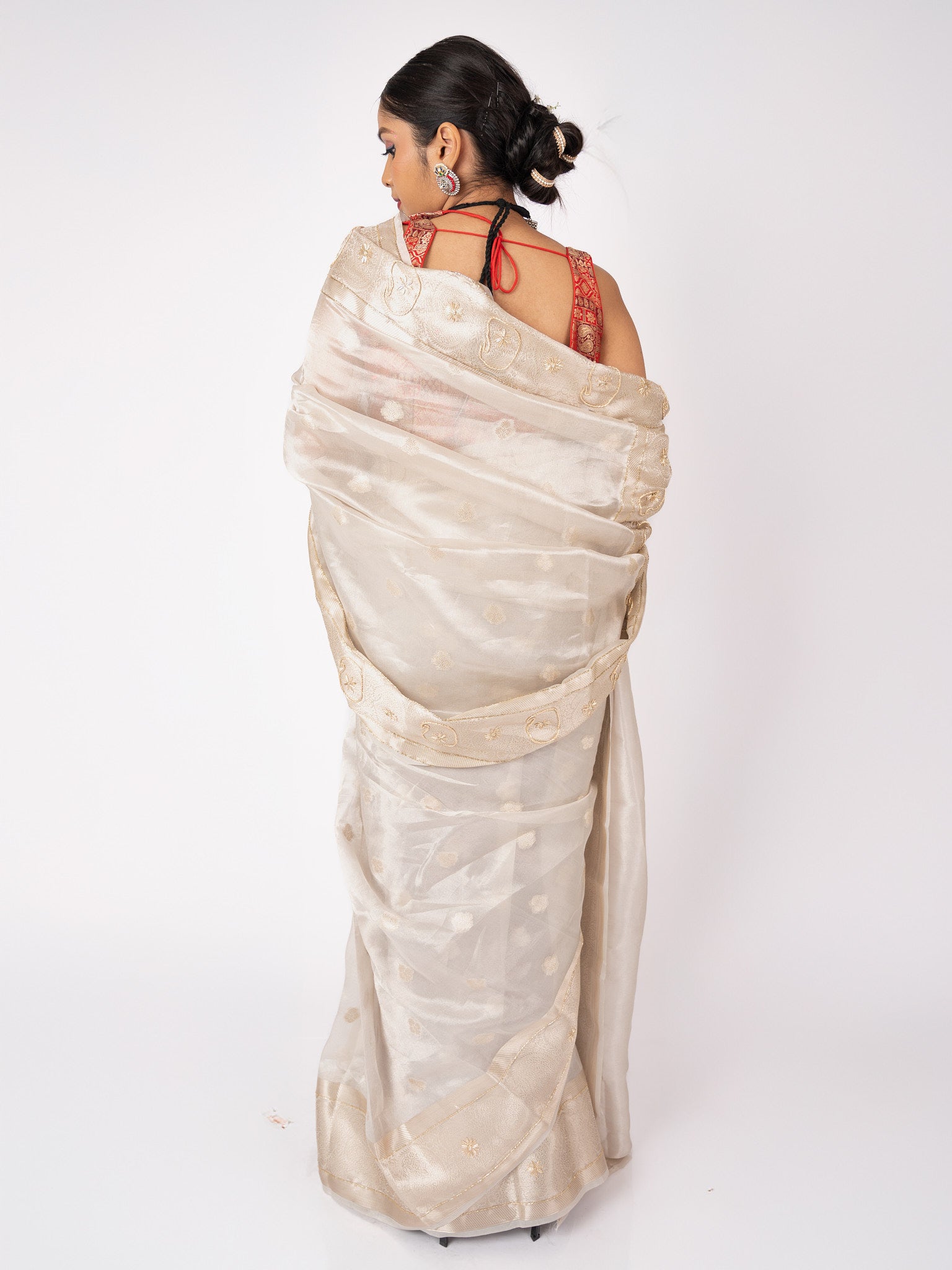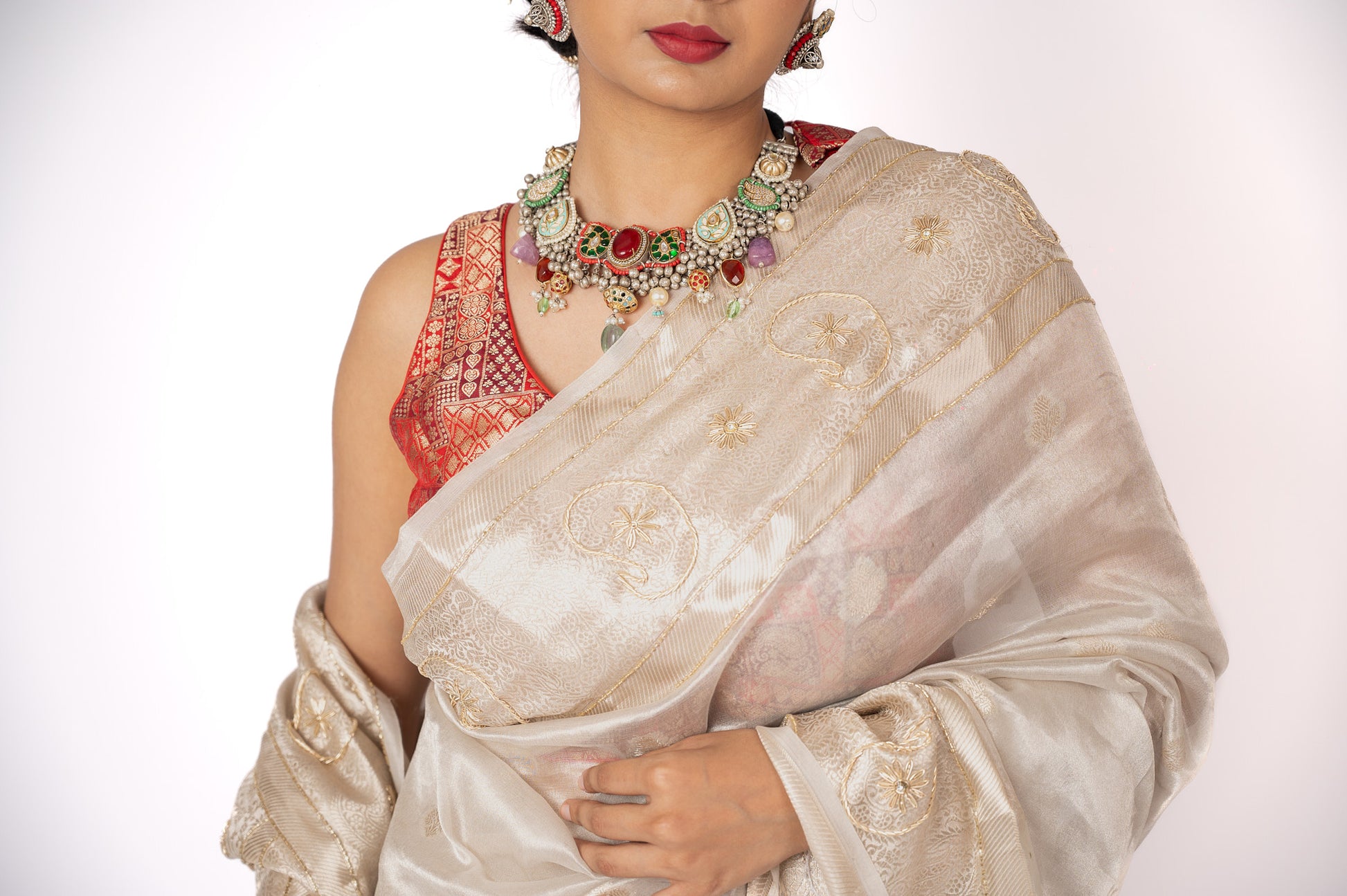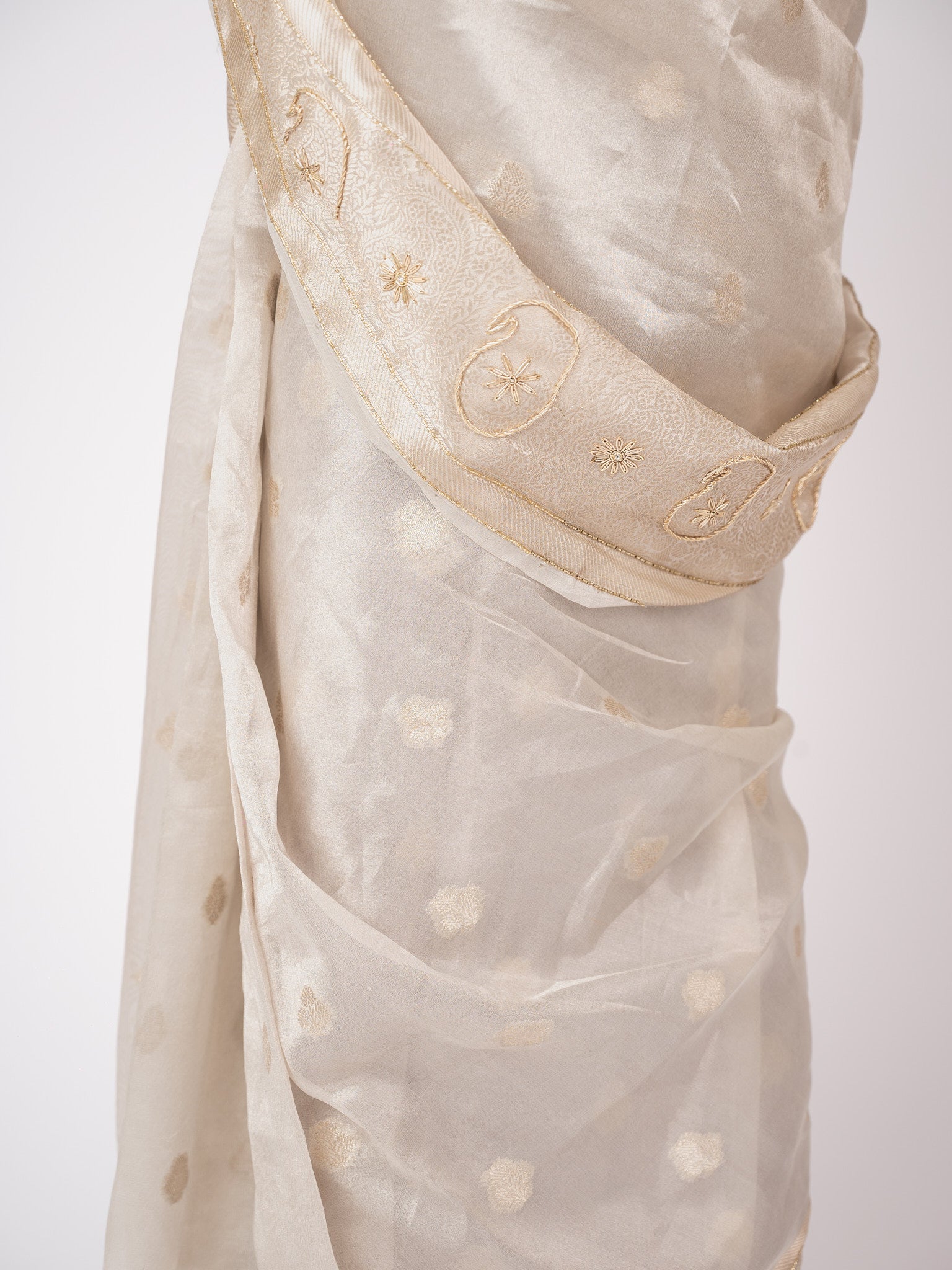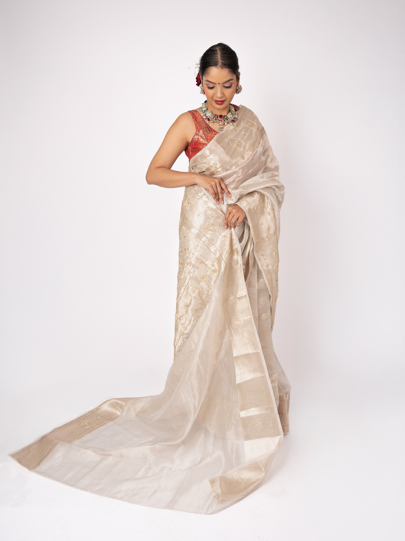 This luxurious tissue saree shimmers with silk and zari, elevated by intricate handwork. Elegant and timeless, it embodies artisanal craftsmanship with a touch of opulence.