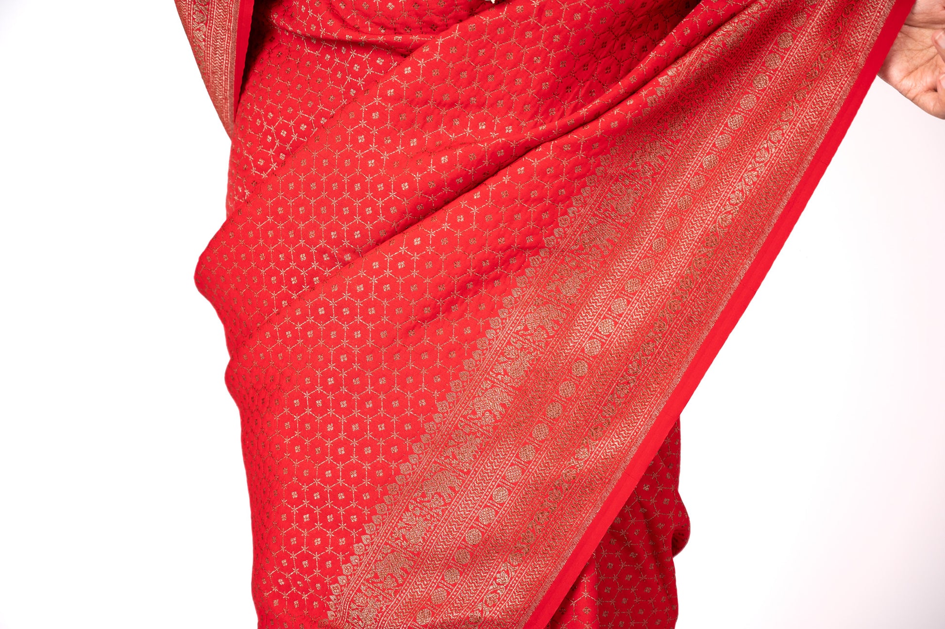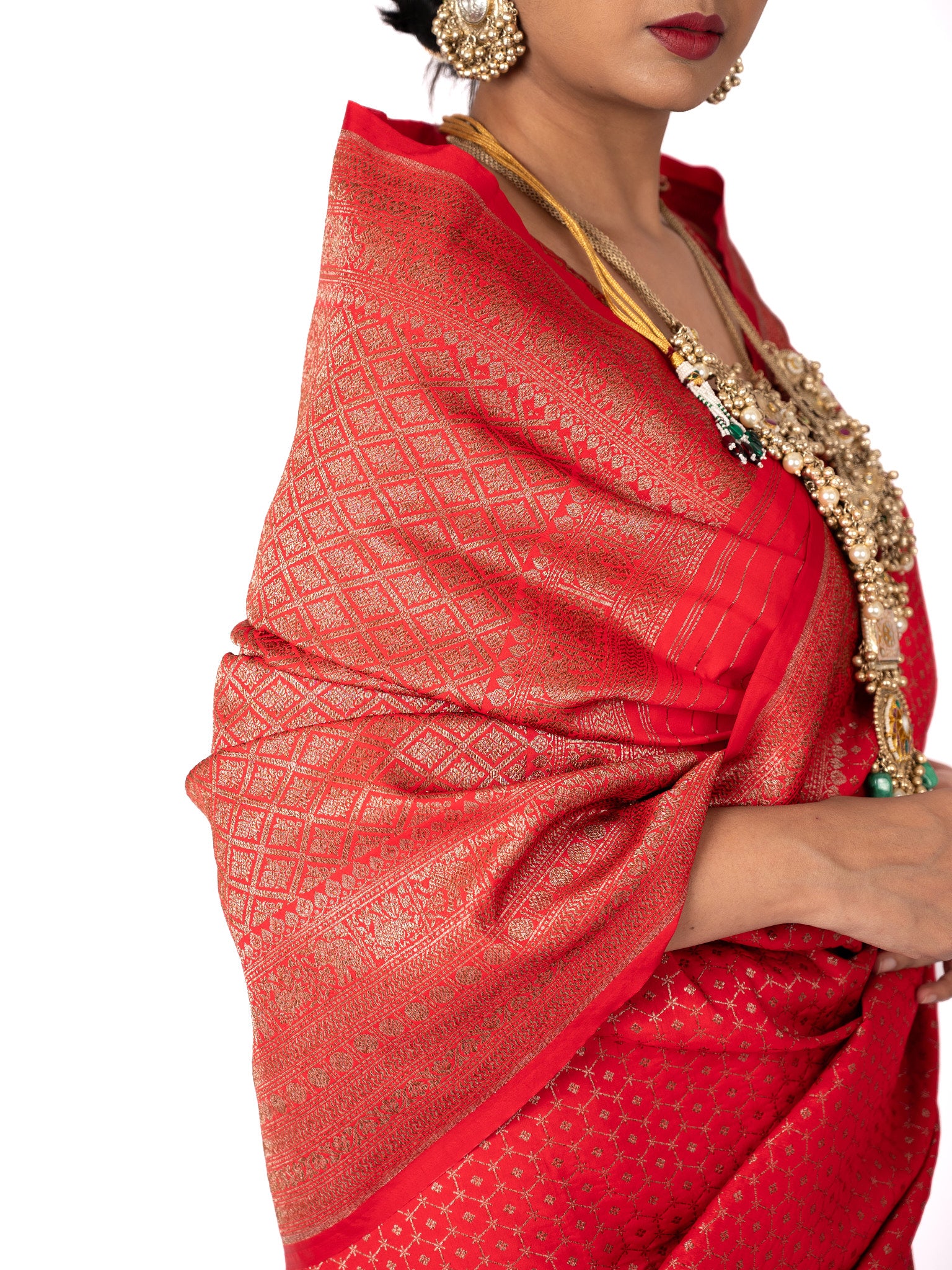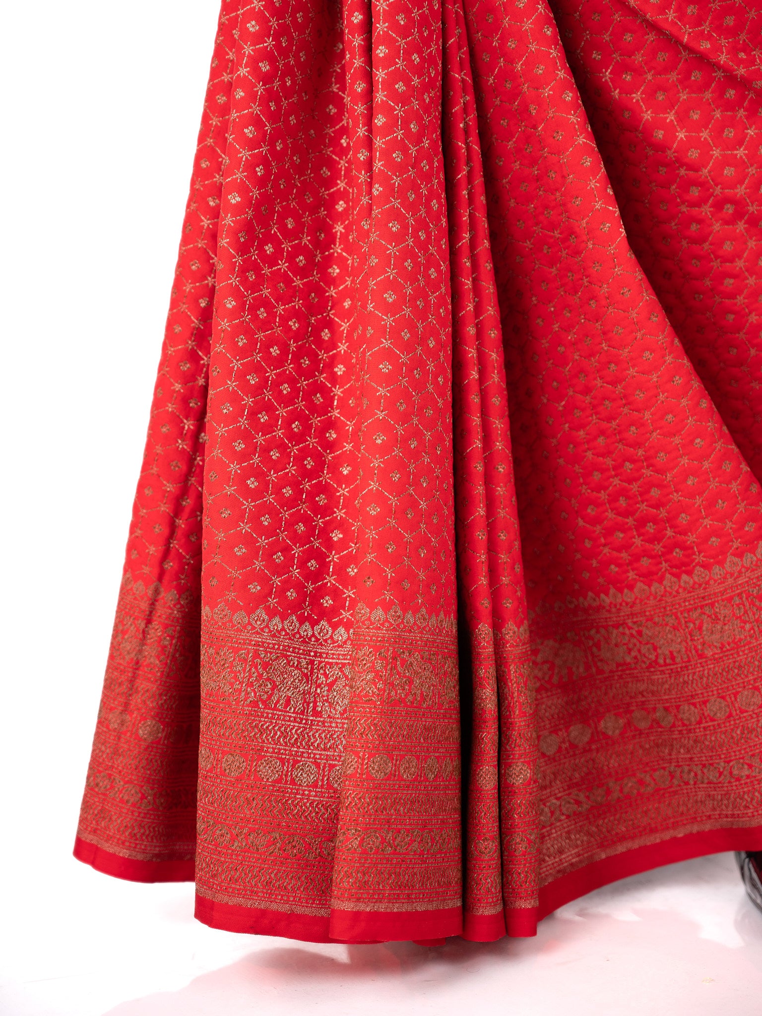 This Banarasi silk saree is adorned with intricate Shikargah motifs, narrating tales of royal hunts and heritage. Elegant and timeless, it celebrates the artistry of traditional Banarasi weaving.