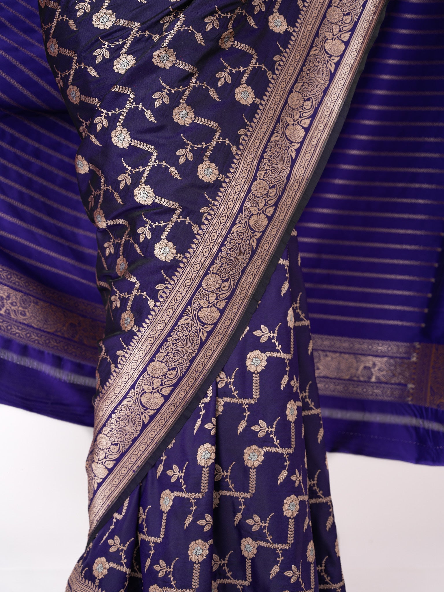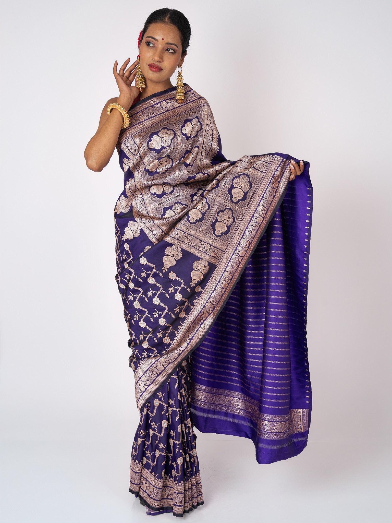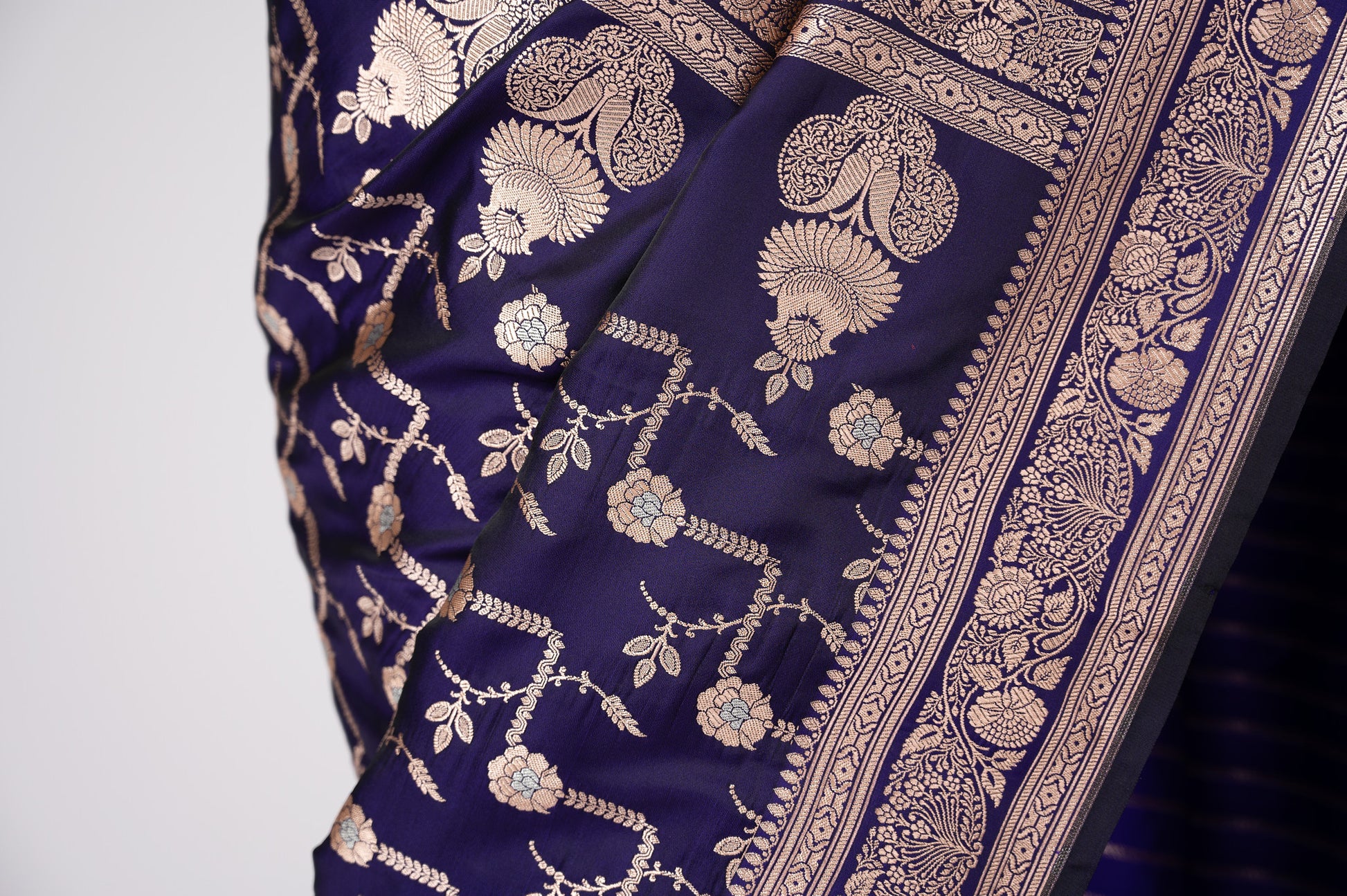 This luxurious purple Katan silk Banarasi saree is handwoven in the intricate Kadwa technique. Elegant and timeless, it radiates opulence through heritage craftsmanship and regal artistry.