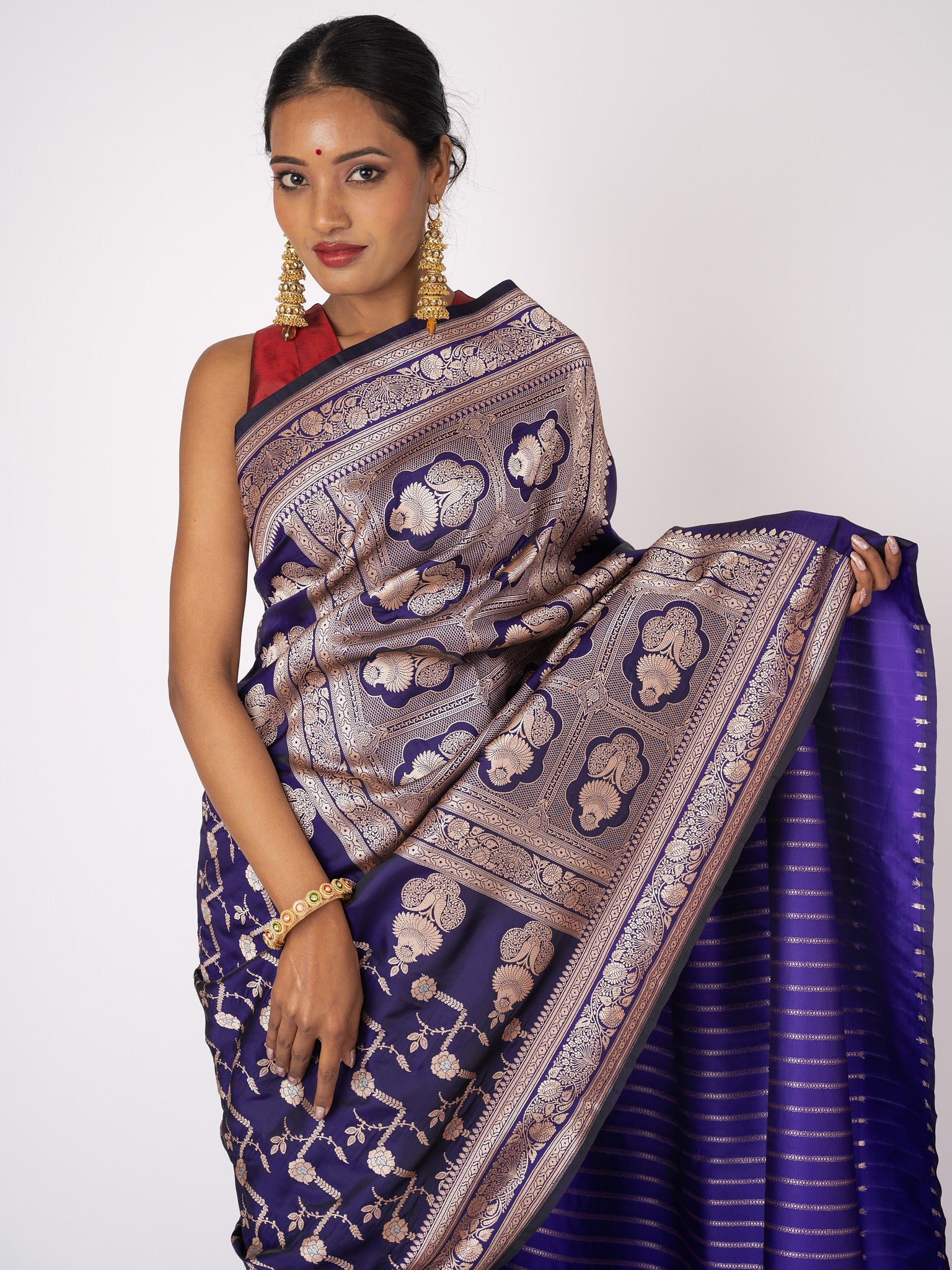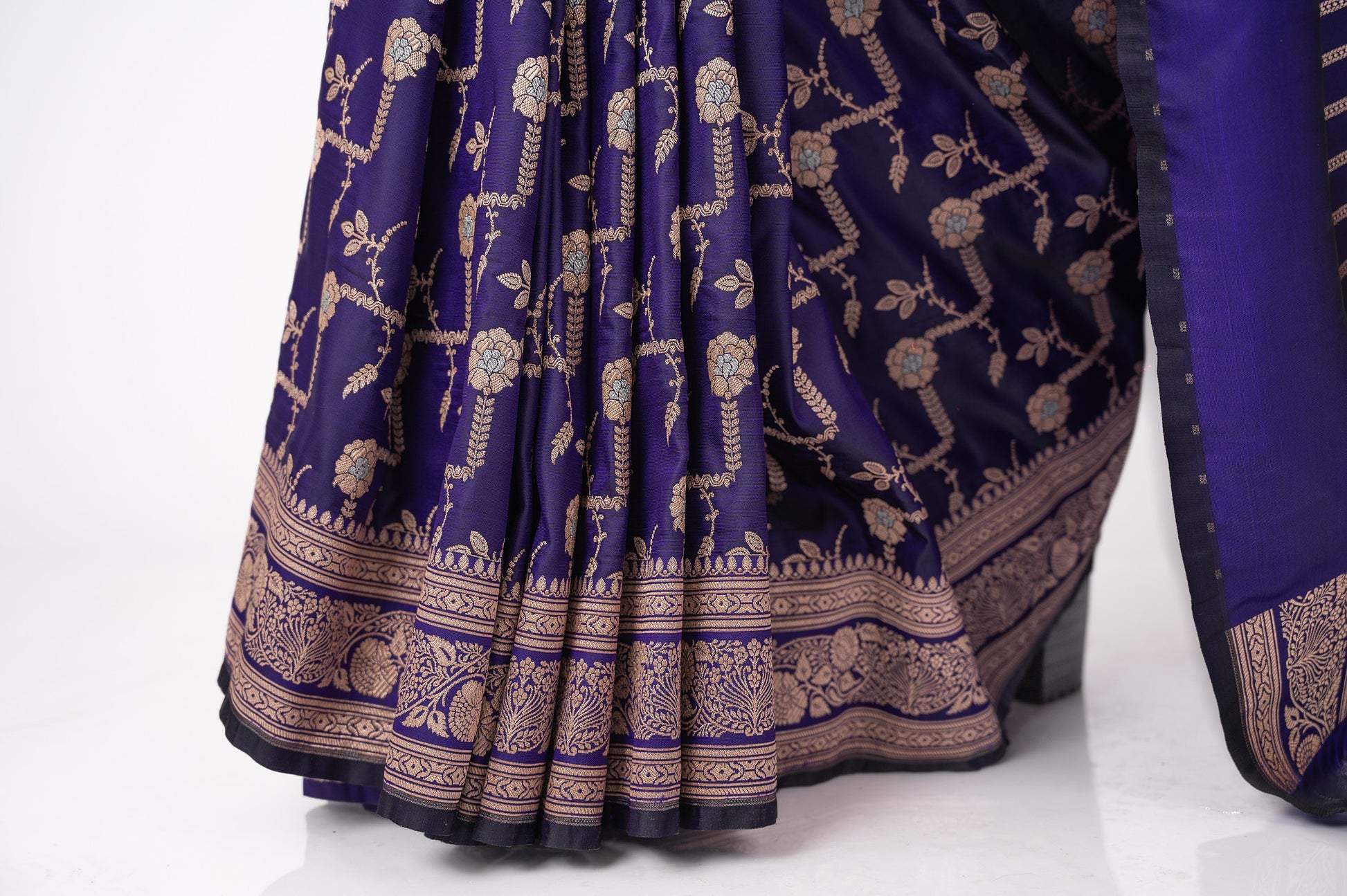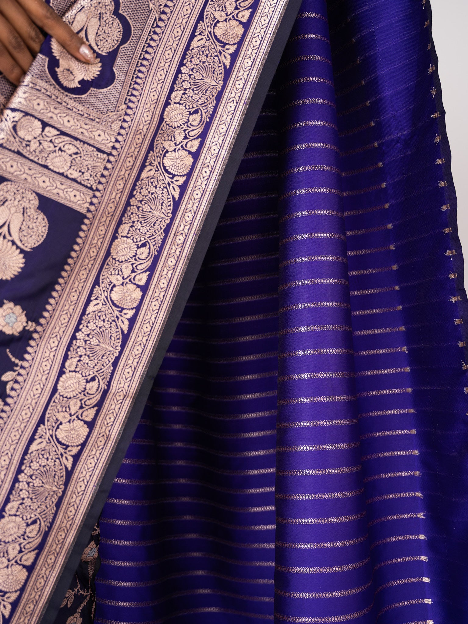 This luxurious purple Katan silk Banarasi saree is handwoven in the intricate Kadwa technique. Elegant and timeless, it radiates opulence through heritage craftsmanship and regal artistry.
