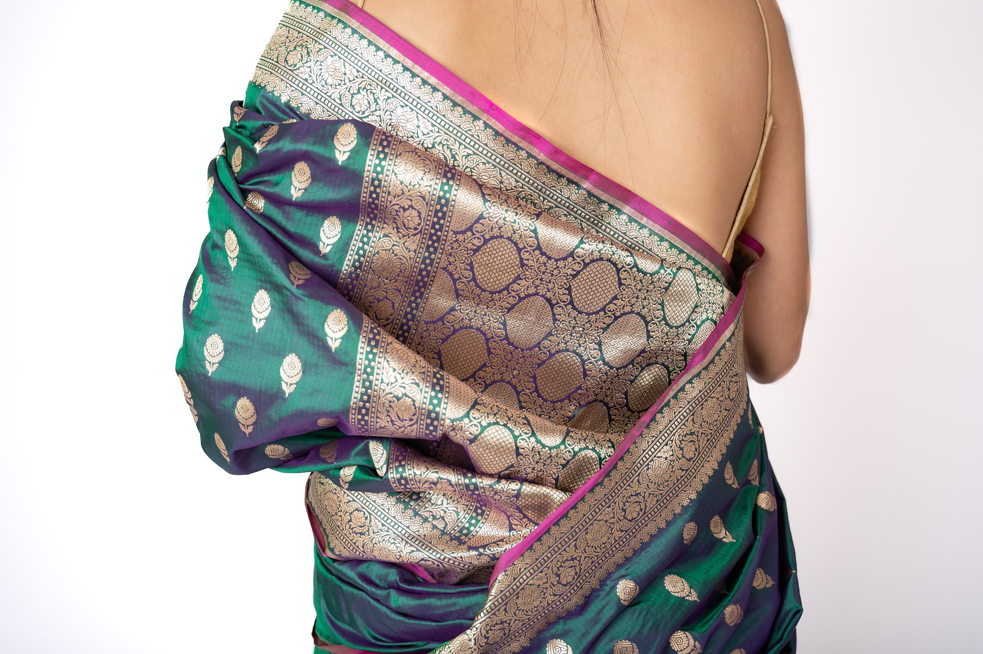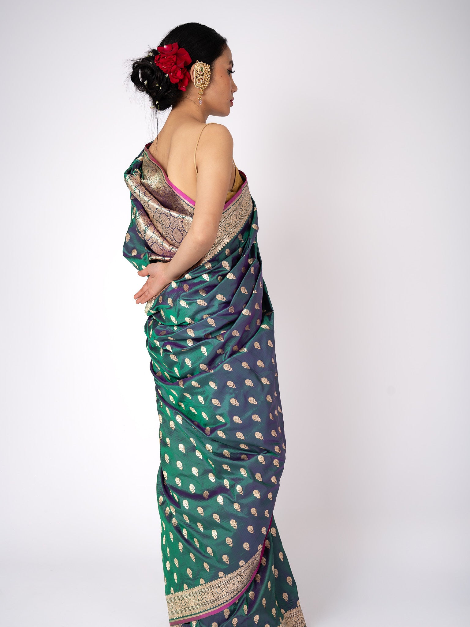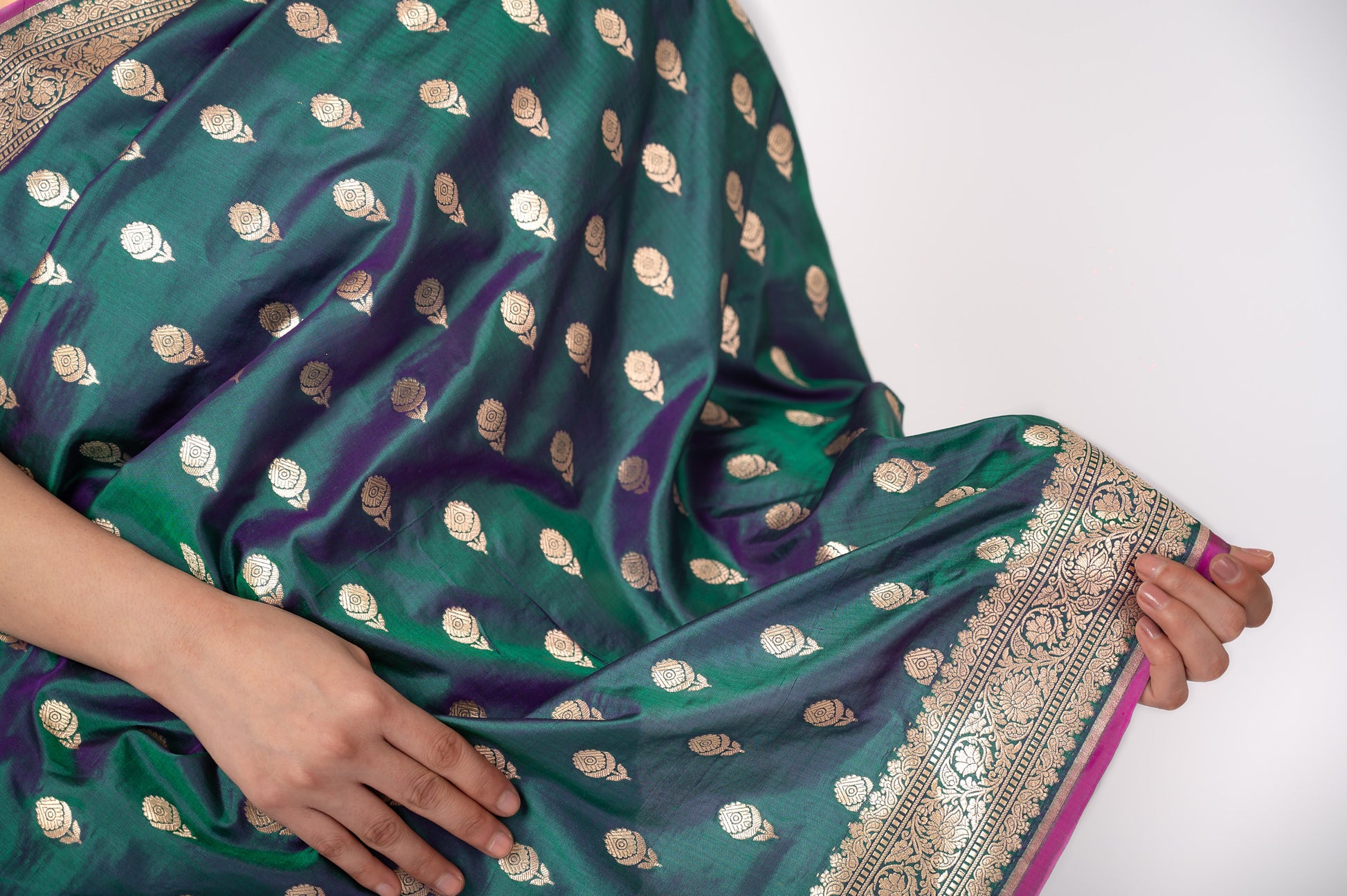 This luxurious Teal Katan silk saree is handwoven in the intricate Kadwa technique, radiating opulence and heritage. Elegant, luminous, and timeless—it is a masterpiece of Banarasi craftsmanship.