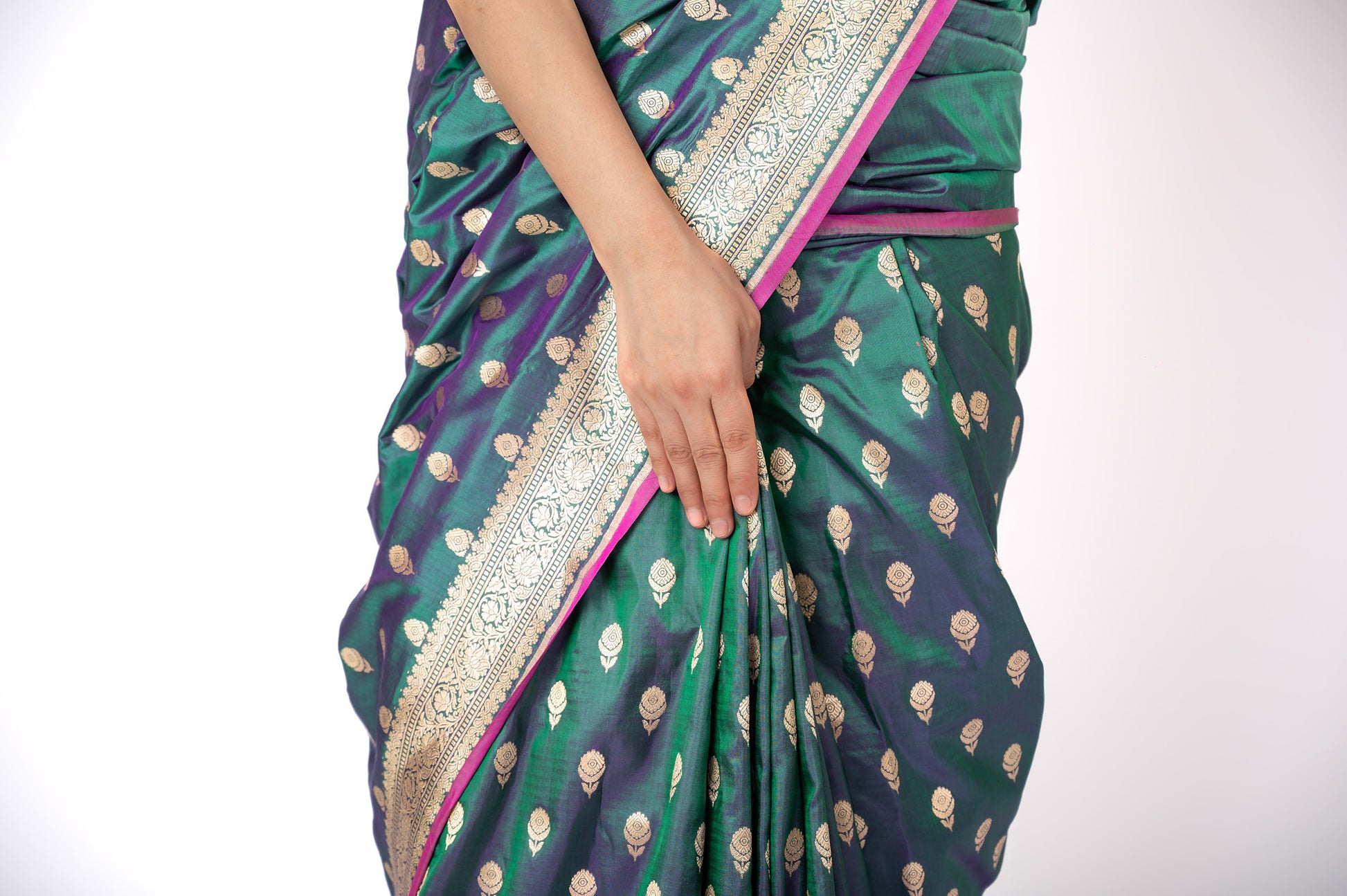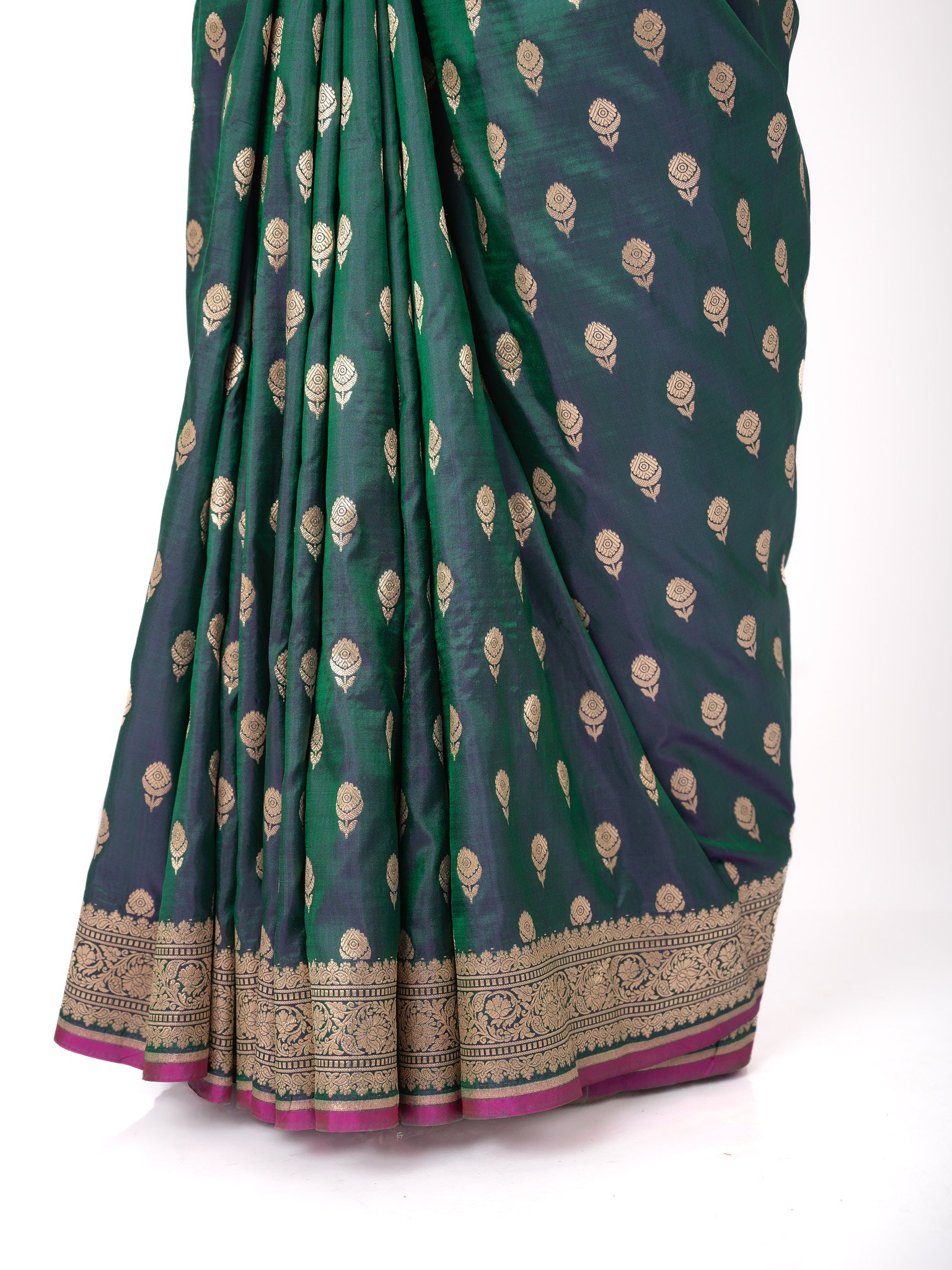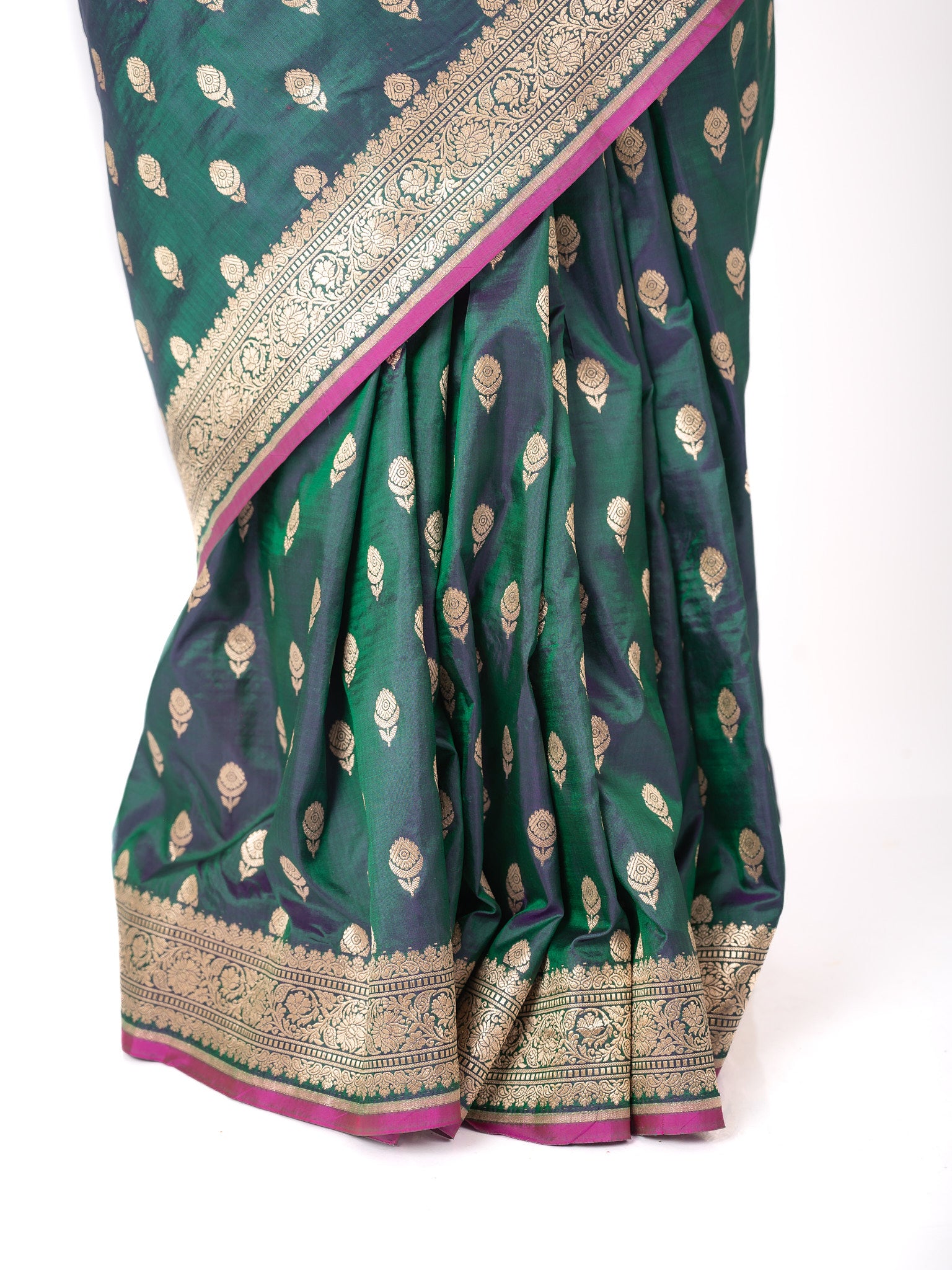 This luxurious Teal Katan silk saree is handwoven in the intricate Kadwa technique, radiating opulence and heritage. Elegant, luminous, and timeless—it is a masterpiece of Banarasi craftsmanship.